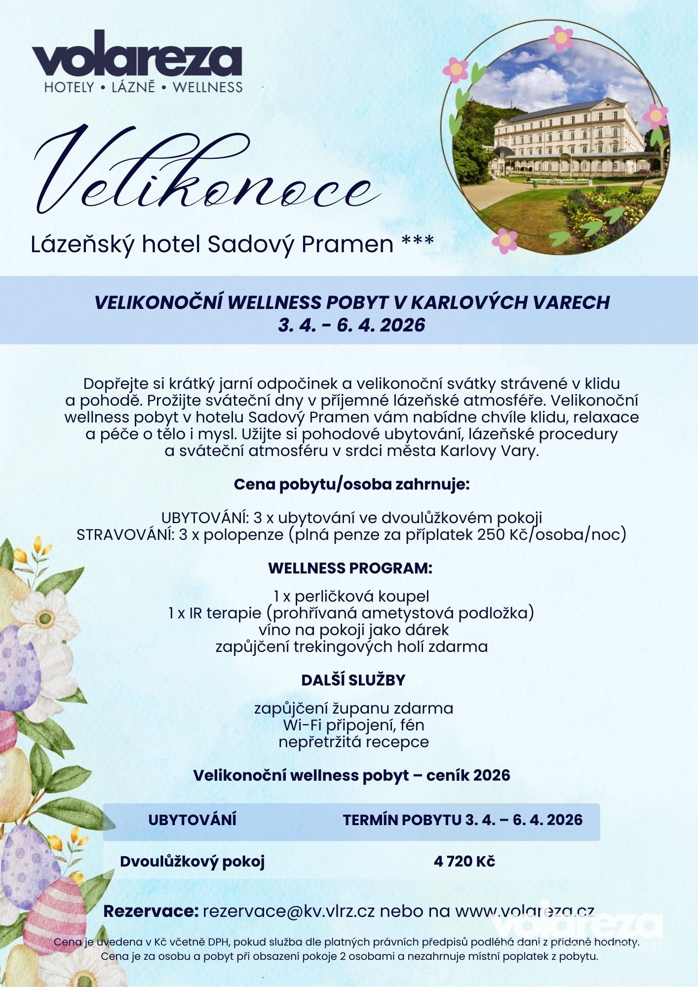 Dopřejte si krátký jarní odpočinek a velikonoční svátky strávené v klidu a pohodě. Prožijte sváteční dny v příjemné lázeňské artmosféře. Velikonční wellness pobyt v lázeňském hotelu Sadový pramen Vám nabídne chvíle klidu, relaxace a péče o tělo i mysl. Užijte si pohodové ubytování, lázeňské procedury a sváteční atmosféru v srdci města Karlovy Vary.