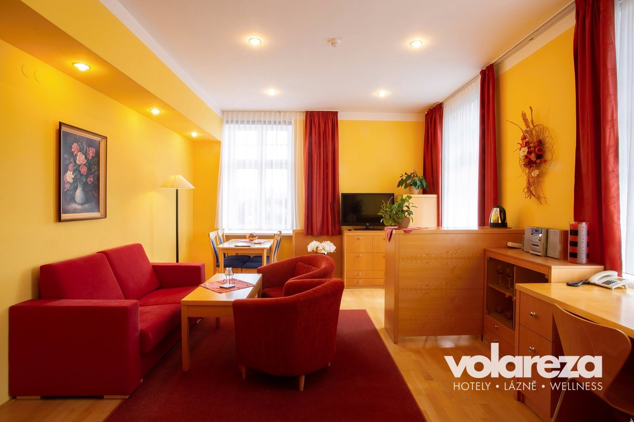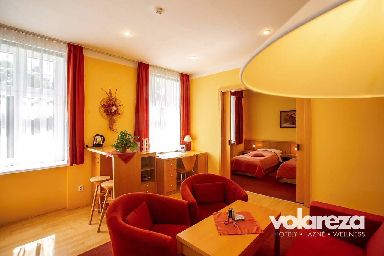 Up-to-date suites are equipped with TV set with satellite reception, radio-clock, minibar, sound system, electric kettle, refrigerator and possibility of Wi-Fi internet connection for a fee according to the Price list. Suites consist of separate bedroom and living room offerring two beds and fold-out sofa bed. It can accommodate up to four persons. The bathroom has bath-tub and toilet.